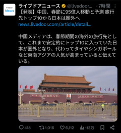 1 名前:名無しさん@涙目です。[] 投稿日:2026/01/29(木) 18:11:57.75 ?2BP(2500) 中国 春節前後に延べ95億人移動と予測 去年より5億人増 中国政府は旧暦の正月にあたる「春節」前後の40日間で、過去最多の延べ95億人が移動する見込みだと発表しました。 中国政府は29日、春節休みを含む来月2日からの40日間で、地域をまたいで移動する人が過去最多の延べ95億人になるとの予測を発表しました。 去年の実績より5億人ほど増えていて、春節休みを去年より1日多い9日間にするなどして低迷する消費を喚起したい狙いもあるとみられます。 今年は車による移動がおよそ8割を占め、鉄道が5億4000万人、飛行機が9500万人に達するとしています。中国政府は春節期間も日本への渡航自粛を呼び掛けています。 中国メディアは人気の旅行先について東南アジアや韓国を挙げ、日本はランク外だと報じています。 3 名前:名無しさん@涙目です。[] 投稿日:2026/01/29(木) 18:12:23.24 ?2BP(1500) ジャップ、恩恵に預かれず発狂wwwwwwwww 366 名前:名無しさん@涙目です。[sage] 投稿日:2026/01/30(金) 07:42:45.67 ID:3NBuitsA0 >>3 なんで英語使ってんの?自分の国の言葉がそんなに恥ずかしいの? 414 名前:名無しさん@涙目です。[] 投稿日:2026/01/30(金) 15:47:19.00 ID:QZnc2Hrk0 >>3 韓国にくれたるわこんなもん 223 名前:名無しさん@涙目です。[] 投稿日:2026/01/29(木) 21:18:40.93 ID:0U/eIHsY0 >>3 むしろ朗報やんけ!アホかwww 20 名前:名無しさん@涙目です。[] 投稿日:2026/01/29(木) 18:18:23.92 ID:iquCP32+0 来ても大して金落とさないんだろ。来なくて結構。この程度で潰れる店はどのみち潰れるからw 26 名前:名無しさん@涙目です。[] 投稿日:2026/01/29(木) 18:19:34.50 ID:grpWGkTs0 あーだこーだ言ってる連中は中国人相手に商売してただけやろ 145 名前:名無しさん@涙目です。[] 投稿日:2026/01/29(木) 19:19:53.25 ID:IsmuS9i50 >>26 それと中国側の工作もあると思う いやマナーよくてちゃんとした中国人はウェルカムだけど、騒がしい、ルールを守れないのは来なくて良い 特に集団で来るのにそういうのが多い 18 名前:名無しさん@涙目です。[] 投稿日:2026/01/29(木) 18:17:35.00 ID:bciM5nFl0 本当に来ないでくれ 臭いし不衛生だし犯罪犯すし、害虫や害獣のほうがマシなくらいだ 362 名前:名無しさん@涙目です。[sage] 投稿日:2026/01/30(金) 07:32:51.57 ID:mm1Ii4K80 汚い中国土人が観光地に来ない方が喜ばれるのがバレちゃったもんなw そもそも碌に日本に金落として無くて観光地を汚すだけの害しか無かったシナ 367 名前:名無しさん@涙目です。[] 投稿日:2026/01/30(金) 07:49:45.16 ID:T0hiuQ5Y0 >>362 「舘山寺温泉に客が来ない」のニュースも酷かった。 サゴーが譲渡したのは中央区舘山寺町の「舘山寺サゴーロイヤルホテル」と隣接する「ホテル山喜」のほか、子会社の「浜名湖遊覧船」。アジア各国からのインバウンド(訪日客)向けに免税店やホテル、観光バスの事業などを手がけるALEXANDER&SUN(アレキサンダーアンドサン、東京)が譲り受けた。譲渡価格は約6億円。 ALEXANDER&SUN 社長: 鄒積人 371 名前:名無しさん@涙目です。[] 投稿日:2026/01/30(金) 07:54:03.92 ID:T0hiuQ5Y0 >>367 >>362 舘山寺温泉の2つのホテルと遊覧船を買った中国系企業は免税店と観光バスを経営してる。 ↑ 中国国際航空で静岡空港まで来た客をバスに乗せてホテルに運び、翌日は遊覧船を楽しんでもらった後に免税店に連れて行くと言う一条龍。 368 名前:名無しさん@涙目です。[sage] 投稿日:2026/01/30(金) 07:49:56.72 ID:mwhMUTxR0 >>362 あの迷惑な白タクも無くなってうれしいよ! 222 名前:名無しさん@涙目です。[] 投稿日:2026/01/29(木) 21:15:34.64 ID:VU5Pao6R0 民泊白タク在日シナチョン猿ざまぁだなw 8 名前:名無しさん@涙目です。[] 投稿日:2026/01/29(木) 18:14:25.51 ID:xqSoSAH00 お前ホテル代クッソ安くなってるの知らんのか? 中国人様々やで 415 名前:名無しさん@涙目です。[] 投稿日:2026/01/30(金) 15:48:01.48 ID:QZnc2Hrk0 >>8 と言う事は国内旅行今がチャンスか 14 名前:名無しさん@涙目です。[sage] 投稿日:2026/01/29(木) 18:15:34.78 ID:h3lED9AW0 プーさんの素晴らしい政策に感謝 59 名前:名無しさん@涙目です。[] 投稿日:2026/01/29(木) 18:31:29.50 ID:sc+LFyeJ0 京都では街の人が祝杯上げてるらしいけどw 53 名前:名無しさん@涙目です。[sage] 投稿日:2026/01/29(木) 18:29:48.86 ID:jflZ0C8w0 京都やが若干へったような気はするけどそれでもまだまだチャンコロいっぱいおるぞ頼むしもう来んといてくれやあいつらおると外でる気もうせんねん 165 名前:名無しさん@涙目です。[sage] 投稿日:2026/01/29(木) 19:41:56.81 ID:TyVGrMwu0 どんな物理量をどう計算して95億人になるの?? そもそも人間って、病院のベッドで寝たきりでもなければ、全員移動してんじゃねーの??? 160 名前:名無しさん@涙目です。[sage] 投稿日:2026/01/29(木) 19:36:20.75 ID:Rk6ykRlc0 1人10回くらいは並行世界から召喚している計算か 195 名前:名無しさん@涙目です。[] 投稿日:2026/01/29(木) 20:28:25.53 ID:bWZaS+2g0 >>160 南京虐殺だと普通 7 名前:名無しさん@涙目です。[sage] 投稿日:2026/01/29(木) 18:14:15.88 ID:SFL08BA+0 そう言って結局どんくらい来るんだよ?(´・ω・`) 184 名前:名