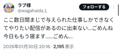 引用元: 752: Vtuberまとめ2026/02/01(日) 12:24:42.45 ホロライブ大丈夫かよ😭 796: Vtuberまとめ2026/02/01(日) 12:25:46.14 >>752 ババアじゃないとこの箱無理なんやろなあ 798: Vtuberまとめ2026/02/01(日) 12:25:48.24 >>752 こんなに病む奴おりゅ? 799: Vtuberまとめ2026/02/01(日) 12:25:48.60 >>752 かなたの仕事は割り振られてるんだよ 派閥以外にホロメンにね😅 806: Vtuberまとめ2026/02/01(日) 12:26:15.16 >>752 山田はサボりやろなと思ってしまうw 814: Vtuberまとめ2026/02/01(日) 12:26:28.69 >>752 若い子ばっかだけどどゆこと🥺 819: Vtuberまとめ2026/02/01(日) 12:26:37.91 >>752 もう個人になれよ 年収2000万でよくね? 週1で配信するだけであとは自由に遊び放題だぞ 829: Vtuberまとめ2026/02/01(日) 12:26:56.72 >>752 いうほど配信する人でもないやん 831: Vtuberまとめ2026/02/01(日) 12:26:58.21 >>752 終わりだよ 837: Vtuberまとめ2026/02/01(日) 12:27:03.27 >>752 すまん カバーってなにをカバーしてんの? 840: Vtuberまとめ2026/02/01(日) 12:27:06.96 >>752 大丈夫だったら10人も辞めたりしない 862: Vtuberまとめ2026/02/01(日) 12:27:51.84 >>840 もう終わりだよこの箱 864: Vtuberまとめ2026/02/01(日) 12:27:54.65 >>837 便座(臭いもの) 865: Vtuberまとめ2026/02/01(日) 12:27:56.06 >>752 この状況で予定通りの休暇に入る奴もいるからヤバい 普通は箱の状況鑑みる 879: Vtuberまとめ2026/02/01(日) 12:28:25.79 >>840 でもまだいるから大丈夫らしい 880: Vtuberまとめ2026/02/01(日) 12:28:26.03 >>865 さくらみこ!? 883: Vtuberまとめ2026/02/01(日) 12:28:29.27 >>752 これでタレントが悪いなんて言えるわけないよね 895: Vtuberまとめ2026/02/01(日) 12:28:54.03 >>879 そろそろ大丈夫じゃない方になりそう 900: Vtuberまとめ2026/02/01(日) 12:29:04.10 >>865 まあ、数人で旅行とかの計画立ててたら 勝手にリスケできないし、ある程度は足並み揃えないといけないからな 914: Vtuberまとめ2026/02/01(日) 12:29:25.29 >>752 派閥入らないとどんな目に合うのこの箱 917: Vtuberまとめ2026/02/01(日) 12:29:27.76 >>865 優遇かな 931: Vtuberまとめ2026/02/01(日) 12:29:49.19 >>895 でも人気ホロメンが言ってたよ…