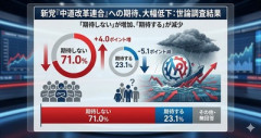 1: ファビピラビル(愛媛県) [ニダ] 2026/02/01(日) 17:15:15.70 ID:ID:Udd7n54J0● 中道に期待しない、4ポイント増えて71% 衆院選トレンド調査で、新党「中道改革連合」に期待しないは71.0%で前回調査より4.0ポイント増えた。期待するは23.1%で5.1ポイント減った。 【速報】 中国国防部『(頼む、頼むからもう)日本が台湾問題を慎重かつ適切に処理するように』勝手に苦しそうにしてて草www 中道・野田佳彦「戦争はしない」 ←問題は、仕掛けられた場合だろ 【異例事態】 中国・習近平帝王、今度は応急管理相を「重大な規律・法律違反の疑い」で調査 事実上の失脚か 閣僚は既に3人失脚…