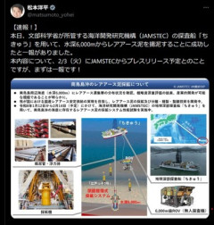 197: 名無し 2026/02/01(日) 17:36:02.81 ID:mOfeDjT80 「ちきゅう」成功の情報来たね(´・ω・`) 明日東洋エンジs高だね まだ見つかってない三洋貿易助かりますか(´・ω・`)? 松本洋平@matsumoto_yohei【速報!】本日、文部科学省が所管する海洋開発研究機構(JAMSTEC)の探査船「ちきゅう」を用いて、水深6,000mからレアアース泥を揚泥することに成功したと一報がありました。本内容について、2/3(火)にJAMSTECからプレスリリース予定とのことですが、まずは一報です!…