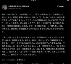 引用元: それでも動く名無し 2026/02/02(月) 12:05:50.11 ID:l4OfsG8z00202 加藤豪将気ままに野球トーク@KatohKimama 最近、WBC侍ジャパンの打順について「どれが最適か」という議論をよく見かけます。打順の最適化は確かに大事ですが、思われているほど劇的な差が出るものではありません。そもそも9人の打順の組み合わせは362,880通り(9!)。その中で、例えば分かりやすく言うと大谷翔平を1番に置いた場合と、極端に9番に置いた場合。この「最も良い打順」と「最も悪い打順」の差でも、統計的には1試合あたり約0.15点しか変わらないと言われています。 「それだけ?」と思うかもしれませんが、162試合のシーズンではこの差が25~40点、勝利数にすると約2.5~4勝分。長いシーズンでは無視できない差です。一方で、最大7試合のWBCのような短期決戦でより重要なのは、打順の並び以上に「誰がスタメンで出るか」。4~5打席立つのと、ベンチで0打席なのとでは、試合への影響はまったく違います。短期決戦は運の要素も大きい。皆さんもワールドシリーズで感じたと思いますが、だからこそ予測が難しく、野球はエンタメとして面白い。 2: それでも動く名無し 2026/02/02(月) 12:06:16.17 ID:l4OfsG8z00202…