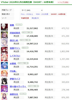 引用元: 361: Vtuberまとめ2026/02/02(月) 15:25:32.34 1月のショート 405: Vtuberまとめ2026/02/02(月) 15:28:24.56 >>361 ニコそんなつえーの!?😳 467: Vtuberまとめ2026/02/02(月) 15:31:34.46 >>361 ニコたん万全になれば最強だな 512: Vtuberまとめ2026/02/02(月) 15:34:22.22 >>405 杉メンはショート見ないから ようやくマリンがショートやってるって認識し始めたのもラーメン出した時ぐらいからだしな ニコはさぼって何もしないって解釈なくなるのいつになるのか 528: Vtuberまとめ2026/02/02(月) 15:35:27.25 >>512 ショートしかやらないやつがサボり判定なのは妥当だが 536: Vtuberまとめ2026/02/02(月) 15:36:10.50 >>528 ショートみないからわからんかったけど余とかショート勢なのか? 540: Vtuberまとめ2026/02/02(月) 15:36:18.83 >>361 ならマリンは3600万ショート以外から再生されてるってこと?ほんとか? 550: Vtuberまとめ2026/02/02(月) 15:37:04.78 >>536 ごめん知らない😐 585: Vtuberまとめ2026/02/02(月) 15:39:03.93 >>528 今の時代はショートでそっからインスタとかでバズって名前売ってくスタンスだぞ いきなり長編耐久なんかやっても無名だと誰も見ない…