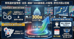1: 名無し 2026/02/03(火) 08:45:12.56 ID:gH9pL2vN0 産経新聞社とFNNが実施した衆院選の情勢調査で、自民党と日本維新の会が合わせて300議席を超える勢いであることが分かりました。一方、立憲民主党と公明党が合流した「中道改革連合」は伸び悩み、公示前の167議席から半減する可能性も浮上しています。連合の芳野友子会長は「気を失うくらいの結果だ」と言及し、強烈な「高市旋風」を前に野党側には焦りが広がっています。 Yahoo!ニュース(産経新聞) ■要約 ・自民と維新が300議席超をうかがう勢いで高市政権への強い支持が鮮明 ・中道改革連合は組織間の協力体制が末端まで浸透せず議席半減の危機 ・前回躍進した国民民主党も愛知などの重点区で自民候補に後れをとる展開 ・連合の芳野会長が「気を失う」と漏らすほどの衝撃的な調査結果に絶句 ・創価学会は約100の重点区を指定し残り1週間での巻き返しに全力投球 【!】 高市総理、腕を引っ張られた瞬間の映像がヤバ過ぎるとネットで話題に → 体が宙に浮くほど引っ張られ手首を押さえ笑顔で対応 ……… 会津若松の女子中学生を土下座させ顔面蹴り暴行事件、動画拡散で警察が捜査開始か → 両親「警察に... 【速報】 金価格が急落 3500円以上も値下がり ストップ安で「サーキットブレーカー」発動 先物売買を一時的に中断…