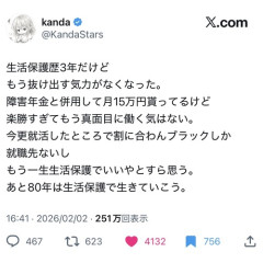 1: 2026/02/03(火) 07:31:38.42 生活保護歴3年だけどもう抜け出す気力がなくなった。障害年金と併用して月15万円貰ってるけど楽勝すぎてもう真面目に働く気はない。今更就活したところで割に合わんブラックしか就職先ないしもう一生生活保護でいいやとすら思う。あと80年は生活保護で生きていこう。— kanda (@KandaStars) February 2, 2026 ※関連記事 【画像】この漫画の「ダメ人間」と付き合っている彼女の話、少し怖くて草wwwww…