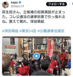 2 : 【衆院選】萩生田光一氏事務所が「非難声明」街頭演説中に他陣営が接近、大音量マイクで“妨害”(日刊スポーツ) - Yahoo!ニュース 衆院選(投開票8日)の東京24区(八王子市の一部)に立候補している自民党の萩生田光一幹事長代行(62)が2日、八王子市内で街頭演説を行った際、同じ選挙区に立候補している無所属新人の深田萌絵氏(47)や陣営関係者が接近し、一時、混乱するひと幕があった。全文はソースで 25 : >>2 選管は何やってんだよ 83 : >>2 演説で練り歩くの公職選挙法違反では? 大石がそれやって問題になってたわ 107 : >>2 うわあ…歩きながらの演説はダメだし ひとの選挙妨害もダメだし完全に公職選挙法違反じゃん 証拠動画があるんだから逮捕されるべきだよ…