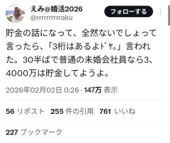 1:以下、?ちゃんねるからVIPがお送りします:2026/02/02(月) 11:42:46.440 ID:2hPWaQ61d0202 2:以下、?ちゃんねるからVIPがお送りします:2026/02/02(月) 11:43:51.409 ID:eajG565A00202 3桁億のはなしでは? 3:以下、?ちゃんねるからVIPがお送りします:2026/02/02(月) 11:44:46.178 ID:2EZ6262500202 結婚後に本性現されるよりマシ…