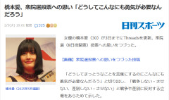 1: 名無し 2026/02/04(水) 19:42:08.34 ID:AiH4m1S0X 女優の橋本愛さん(30)が3日までにSNSを更新し、8日に投開票される衆院選への思いをつづりました。「どうしてまっとうなことを言葉にするのにこんなにも勇気が必要なんだろう」と切り出した橋本さんは、「戦争しない・させない、差別しない・させない」と自身の立場をあらためて表明。その上で「投票、行かなきゃ」と呼びかけ、1票を投じる意義について「微力だろうと0じゃない」と強い決意を記しています。 日刊スポーツ ■要約 ・橋本愛が衆院選に向けて投票への思いをSNSに投稿 ・まっとうなことを言うのに勇気が必要な社会の空気に疑問を提示 ・戦争や差別に反対する意思を明快に示し平和への願いを強調 ・一票の力は微力でもゼロではないと述べ投票の重要性を有権者に訴求 【悲報】中道、電話作戦開始へ「このままだと中道は敗北です」 あの党の十八番を発動! 【速報】 中国の王毅外相と会談したロシア・ショイグ、日本に『とんでもない発言』をしてしまう!!!!! 消防士「裁判員裁判の招集がありました。いかねばなりません」署長「お前真面目か」阻止して停職1カ月…