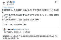 1:それでも動く名無し 2026/02/04(水) 21:27:40.15 ID:L1hA1IJy0 選挙期間中に、みずほ銀行エコノミストが首相発言を非難という特異な事象。「日本の未来の為に円安容認を止めなければならない」という覚悟の結果だと思うが、長い文章を読めない人達が円安容認を支えている。「これは、ダメかも分からんね」 — ひろゆき (@hirox246) February 3, 2026…