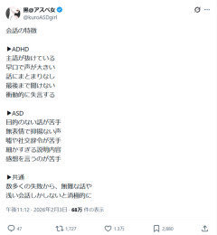 1: 2026/02/04(水) 23:14:34.58 会話の特徴▶︎ADHD主語が抜けている早口で声が大きい話にまとまりなし最後まで聞けない衝動的に失言する▶︎ASD目的のない話が苦手無表情で抑揚ない声嘘や社交辞令が苦手細かすぎる説明内容感想を言うのが苦手▶︎共通数多くの失敗から、無難な話や浅い会話しかしないと消極的に— 黒@アスペ女 (@kuroASDgirl) February 3, 2026 ※関連記事 【画像】アスペさん、この漫画の『友人が席を代わった理由』がわからず困惑…お前らはわかるよな?????…