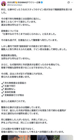 2 : 4 : • 任意同行・全面協力(違法物ゼロ)にもかかわらず、即座に過剰拘束(羽交締めなど)で強制採尿。 • カテーテル強引挿入により陰部に裂傷・損傷 → 陰性結果でも身体的被害残る。 • 令状の有無・説明が不明瞭(または不十分)。 • 執行が「医学的に相当な方法」要件を逸脱(過度な暴力・損傷発生)。 • タトゥーショップ勤務という外形だけで嫌疑を濃厚視した疑い(差別的運用)。 • 結果:協力した市民に怪我・営業損害のみ残る不当な警察運用。 6時間ほど拘束されて流石に営業にならないので任意同行したら署に着いた瞬間態度急変させて強制に切り替えるからと羽交締めにして尿道に管刺されました!協力すると一緒に署までわざわざ歩いて行ったら騙し討ち pic.twitter.com/doASdakG9o— きまる君🫡渋谷GRAY/チラクシー広報 (@kimarukundayo) February 2, 2026…