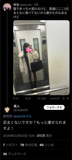 1: 2026/02/05(木) 03:30:41.35 やばい面白い私別に拒食症な訳でもないからこういうこと言われて落ち込むと思ってんのかな太いわけねーだろ — ゆな (@qconb) February 4, 2026 ※関連記事 【画像】この漫画の「ダメ人間」と付き合っている彼女の話、少し怖くて草wwwww…