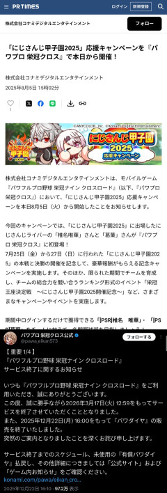 【悲報】パワプロさん、にじさんじとコラボ半年でサ終してしまう・・・