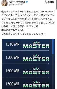 1: 名無しのアニゲーさん 2026/02/05(木) 01:38:59.983 ID:dyPmU.avd かわいそう 2: 名無しのアニゲーさん 2026/02/05(木) 01:39:35.836 ID:dyPmU.avd 複数キャラマスターにするとか言ってMR1500ですぐほかのキャラやってる人が、ダイヤ帯ってメチャクチャ多いんだけど相手にするのがしんどすぎるこっちは開始10秒でこれは何やっても勝てないのがわかる、マジで心が折れそうになる本当に勘弁してほしいこれ初狩りとやってること変わらんくね?…