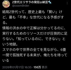 1 : 以下、?ちゃんねるからVIPがお送りします :2026/02/05(木) 23:19:34.992 ID:sKrQt6wy0.net結局Z世代って、歴史上最も「賢い」けど、最も「不幸」な世代になる予感がする。情報の洪水の中で正解は分かってるのに、実行するためのリソースだけが圧倒的に足りない。「知っているのに、できない」という地獄。スマホの中で世界の全てを見ながら、6畳一間で孤独死する未来が、俺たちを待っている— Z世代エリサラの発狂@納豆🔩 (@cosm0rder) January 17, 20262 : 以下、?ちゃんねるからVIPがお送りします :2026/02/05(木) 23:19:50.693 ID:sKrQt6wy0.netそれはたしかに不幸やな転載元スレッド:…