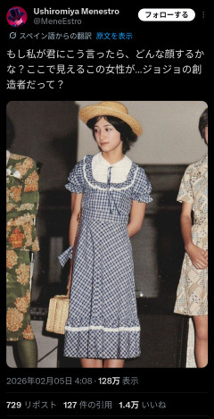 1:それでも動く名無し:2026/02/06(金) 00:21:00.87 ID:EuwlJChe0.net 荒木飛呂彦先生の女装姿が流出、ファンは「美少女すぎ」や「ビビった」感想で沸騰(2026/02/05)| …c942b3a4810-1770291900 2:それでも動く名無し:2026/02/06(金) 00:21:24.11 ID:EuwlJChe0.net ちな高校の時の文化祭らしい 3:それでも動く名無し:2026/02/06(金) 00:22:03.96 ID:OyeVPcRB0.net 儚げな美少女やね…