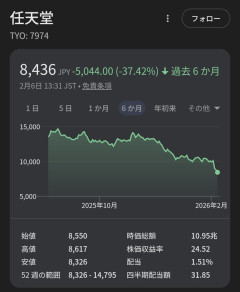 引用元: それでも動く名無し 2026/02/06(金) 13:48:29.90 ID:BtlRAHAV0 2: それでも動く名無し 2026/02/06(金) 13:49:03.12 ID:hOJKG0k50 昨日のニンダイ酷かったしまだまだ下がりそう…