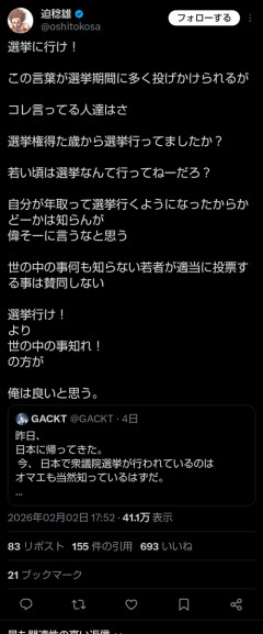 1: 2026/02/06(金) 11:00:10.99 選挙に行け!この言葉が選挙期間に多く投げかけられるがコレ言ってる人達はさ選挙権得た歳から選挙行ってましたか?若い頃は選挙なんて行ってねーだろ?自分が年取って選挙行くようになったからかどーかは知らんが偉そーに言うなと思う… — 迫稔雄 (@oshitokosa) February 2, 2026 ※関連記事 【悲報】声優の緒方恵美さん「戦争はしない、させない。選挙で伝える」→炎上してしまう…