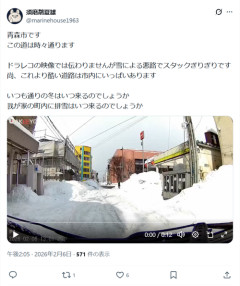 1: 2026/02/06(金) 14:29:38.36 青森市ですこの道は時々通りますドラレコの映像では伝わりませんが雪による悪路でスタックぎりぎりです尚、これより酷い道路は市内にいっぱいありますいつも通りの冬はいつ来るのでしょうか我が家の町内に排雪はいつ来るのでしょうか pic.twitter.com/hqhR4W6eUy— 須磨鷸夏雄 (@marinehouse1963) February 6, 2026 ※関連記事 【動画】撮影者が8割ぐらい悪いドラレコ発見される…
