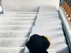 階段の横にある子犬用のスロープ。 ちゃんと降りる前に ダミーでテストだわん! 賢い子犬はこうします……