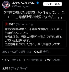 引用元: 2832: Vtuberまとめ 2026/02/07(土) 01:19:59.07 ID:WmbmVcSU タモリがタラ松擁護していたのは余計なお世話すぎて笑った 2858: Vtuberまとめ 2026/02/07(土) 01:21:15.07 ID:oNd2fIl0 >>2832 ニコニコ勢全員巻き込むのやめーや言われてて笑ったわ 2859: Vtuberまとめ 2026/02/07(土) 01:21:19.86 ID:qvUVxCyp >>2832 余計なお世話どころか狙って触れて数字稼ぎに言ってる可能性まであるからなあ… 2874: Vtuberまとめ 2026/02/07(土) 01:21:56.43 ID:iFOuwzJ2 >>2832 寄生だよ🥺 2883: Vtuberまとめ 2026/02/07(土) 01:22:10.60 ID:qncdKdMP >>2832 めちゃくちゃバズってて流石でよ🤗 2900: Vtuberまとめ 2026/02/07(土) 01:23:19.62 ID:ZGH2a6HF >>2883 インプレ稼げて嬉しそう😊 2919: Vtuberまとめ 2026/02/07(土) 01:23:54.60 ID:p4flnQmc >>2883 狙い通りですね 2923: Vtuberまとめ 2026/02/07(土) 01:24:07.51 ID:V6tOK9xQ >>2883 ここからニコニコ出の奴が皆過去を掘られることになったらすげえ恨まれそう🤗 2927: Vtuberまとめ 2026/02/07(土) 01:24:17.69 ID:oNd2fIl0 >>2900 青バッジついてるから金はいるもんな🤗 2933: Vtuberまとめ 2026/02/07(土) 01:24:28.40 ID:tBz6ejAh >>2883 1000万インプの収益ってどれくらいなんだろうな 2939: Vtuberまとめ 2026/02/07(土) 01:24:43.90 ID:A8cpXggu >>2900 これでいくら稼げるんだろ🤔 2942: Vtuberまとめ 2026/02/07(土) 01:24:50.12 ID:KAZCbJ3f >>2883 昼見た時より伸びてるな 2958: Vtuberまとめ 2026/02/07(土) 01:25:24.37 ID:fvvMi3V2 >>2832 数字稼ぎに来ただけだぞあいつ 2961: Vtuberまとめ 2026/02/07(土) 01:25:28.01 ID:o8xqEC9s >>2883 Xは炎上に便乗は収益が発生しないとかしろ😡 2965: Vtuberまとめ 2026/02/07(土) 01:25:48.46 ID:xNoeNbPZ >>2923 もう散々掘られてネタにしてる人もいるから大丈夫や 2966: Vtuberまとめ 2026/02/07(土) 01:25:48.85 ID:fvvMi3V2 >>2883 狙い通り稼いでるのか 2976: Vtuberまとめ 2026/02/07(土) 01:26:08.26 ID:n8G410cf >>2859 普通にそれ以外ないだろ 2977: Vtuberまとめ 2026/02/07(土) 01:26:14.58 ID:V6tOK9xQ >>2965 ほな大丈夫か…🙄 2986: Vtuberまとめ 2026/02/07(土) 01:26:35.07 ID:S1wEQxUJ >>2883 粗品とかタラチオとか使わず自力でバズれ😢 そんなんだから櫻子チャンに負けるんだ😢 3012: Vtuberまとめ 2026/02/07(土) 01:27:29.46 ID:KGSsSKNX >>2883 砂かけ罪としてこいつ懲らしめたいわ🥺 3109: Vtuberまとめ 2026/02/07(土) 01:33:05.51 ID:oNd2fIl0 >>2933 多分フォロワー数的にもこれだけで8000〜1万円くらい 3174: Vtuberまとめ 2026/02/07(土) 01:35:41.91 ID:ZPufuQvC >>3109 ショートより酷くない? 3209: Vtuberまとめ 2026/02/07(土) 01:37:35.85 ID:tBz6ejAh >>3109 まぁお小遣いって感じか 3236: Vtuberまとめ 2026/02/07(土) 01:39:22.05 ID:NaAaUDLE >>2883 「いや全員じゃないだろ」っていう層も取り込んでるからな でびがやろうとした手法 3362: Vtuberまとめ 2026/02/07(土) 01:46:25.20 ID:oNd2fIl0 >>3174 まぁ流石にshortより稼げたらヤバいだろ 炎上してるポストとかにリプ送りまくるだけである程度稼げるって 考えたらだいぶハードル違うし…