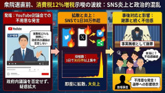 1: 名無し 2026/02/07(土) 14:38:12.45 ID:Kj8fR2n9S 衆院選の投開票を目前に控え、自民党の新人候補がYouTubeの討論会で、消費税を12%に引き上げる政府内の議論について「来てないわけではありません」と否定しなかったことが大きな波紋を広げている。 この発言はSNS上で瞬く間に拡散され、1日だけで関連投稿が約30万件に達する事態となった。候補者は後に「事実無根の臆測」として陳謝し、政府内での議論を完全に否定したが、有権者の間では不信感がくすぶっている。首相周辺からは「不用意な発言で迷惑だ」といった苦言も出ており、選挙戦最終盤の情勢への影響が懸念されている。 毎日新聞 ■要約 ・衆院選投票を前に自民党候補が消費税12%増税を示唆する発言を行い波紋 ・YouTubeの討論会で政府内の議論を否定しなかったことで疑惑が拡大 ・発言はSNSで即座に拡散され1日で30万件以上の投稿が集中する事態に ・候補者本人は後に事実無根として謝罪するも有権者の間では不信感が継続 ・首相周辺からは不用意な発言に対し選挙への影響を懸念する苦言が噴出 【緊急】 今日いきなり仕事辞めてきたwwww 人気漫画家 「正直言うとこの選挙は中止してほしい」 【警告】 精神科医『苦労してない人間の顔が幼い理由、たぶんこれ』…