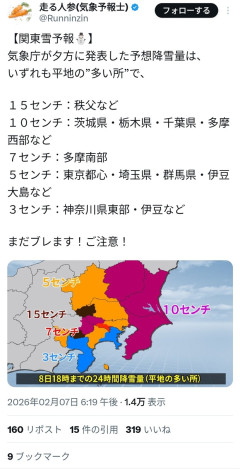 1:2026/02/07(土) 19:52:08.87 ID:jlAK7Vs40.net【関東雪予報⛄】気象庁が夕方に発表した予想降雪量は、いずれも平地の”多い所”で、15センチ:秩父など10センチ:茨城県・栃木県・千葉県・多摩西部など7センチ:多摩南部5センチ:東京都心・埼玉県・群馬県・伊豆大島など3センチ:神奈川県東部・伊豆などまだブレます!ご注意! pic.twitter.com/TTfCp2Rz6g— 走る人参(気象予報士) (@Runninzin) February 7, 2026転載元スレッド:…