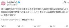 1: 2026/02/07(土) 13:27:17.54 ぼくは戦争反対で平和主義者なので周辺国から簡単に攻め込まれないよう国家安全保障や防衛力の強化をしっかりと考えている政党に投票しました👀戦争反対です— かんざきひろ (@kanzakihiro) February 7, 2026 ※関連記事 【悲報】イラストレーター「私がキャラデザ・原画を担当した作品のアニメ化が決定!」→「すいません、全て嘘で妄想でした」…