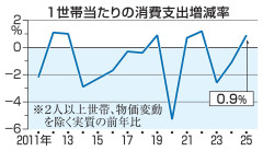 1 : 総務省が6日発表した2025年の2人以上世帯の家計調査によると、家計の消費支出に占める食費の割合を示す「エンゲル係数」は28.6%だった。1981年以来、44年ぶりの高水準となった。食品価格の高騰が影響した。1世帯当たりの月平均消費支出は31万4001円で、物価変動の影響を除く実質で前年比0.9%増となった。プラスは3年ぶり。…