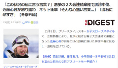 1: 名無し 2026/02/08(日) 13:54:12.82 ID:LknAvDyF0 2月8日、フリースタイルスキー女子スロープスタイルで、左膝負傷により北京に続き五輪2大会連続で棄権となった近藤心音が自身のSNS投稿に届いた誹謗中傷に反応し、波紋を広げている。 近藤は「もし選ばれても次は辞退してくださいね」という心ない言葉に対し、「それは今この状況にある私に対して言う言葉でしょうか?辞退するもしないも枠を掴み取った私が決めることです」と反論。 また、取材時のコメントへの批判に対しても「今日私が口にした言葉で残念なところなど何一つありません」と毅然とした態度を示した。 Yahoo!ニュース ■要約 ・フリースタイルスキー近藤心音が左膝負傷により2大会連続の五輪棄権 ・SNS上で次は辞退して等の心ない誹謗中傷が相次ぎ波紋 ・近藤本人が決めるのは自分とSNSで毅然と反論 ・インタビューへの批判コメントにも切り取りを懸念し不快感を表明 ・負傷に苦しむアスリートへのネット上での攻撃が深刻な問題に 【速報】 トヨタ、ついに『限界突破』してしまう!!!!!! 中道改革連合・野田共同代表「熱狂の後に何が起きるのか、よく思い出していただきたい」 蕎麦 + コロッケ ← 気持ち悪い…