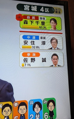 1: 煮卵 ★ 2026/02/08(日) 21:31:17.10 ID:nADaTwaF9 宮城4区で自民党から立候補している元グラビアアイドル、タレントの森下千里前衆院議員(44)が、中道改革連合の安住淳共同幹事長との激戦を制し、選挙区での初勝利を確実にした。 森下氏は地元の事務所で「おばんでございます!」と、笑顔をあふれさせてあいさつ。「まだまだ足らぬところもある私でありますが、これからも皆さまにしっかりご指導していただきながら、地域のためには働いていきたい。日本列島を強く豊かにしていく! 皆さんとともに頑張ってまいります」と語った。 初の国政選挙挑戦だった21年衆院選では宮城5区から出馬したが安住氏の前に敗れ、会見では涙を見せた。元々は名古屋出身。ただ、落選後も石巻に自宅と事務所を構え、「辻立ちクイーン」を自称して連日、街頭演説に立ち続けた。 24年には比例東北ブロック単独第2位で当選。高市内閣では環境政務官を務めるなど、着実に経験を積み重ねた。タレント時代は華やかなグラビア活動やテレビ出演も多かったが、ナチュラルメークに白シャツ、ダークスーツで語る政治家としての姿もすっかり板につき、地元で政治活動に打ち込む真摯(しんし)な姿に、有権者の支持も広がった。 高市首相、自民党の強さを象徴する形で、今回は「森下千里」と書かれた投票を集め、強敵相手に悲願の勝利をおさめた。 [日刊スポーツ] 2026/2/8(日) 21:27 引用元: ・ スポンサーリンク スポンサーリンク 35: 名無しどんぶらこ 2026/02/08(日) 21:36:09.29 ID:rUyz7T2X0 >>1 目の前のやつにお湯ぶっ掛けたい衝動にたまに駆られるとか言ってた人? 38: 名無しどんぶらこ 2026/02/08(日) 21:36:38.29 ID:/qC6ucW10 >>1 当選喜び様子がテレビに映るが 44歳でもきれいだわ 3: 名無しどんぶらこ 2026/02/08(日) 21:32:02.32 ID:VNOOKTEa0 ガチ詳しい人に聞きたいんだけど、 自民党大勝で地方の中小サッシ製造会社の仕事減る?潰れる? 19: 名無しどんぶらこ 2026/02/08(日) 21:34:19.24 ID:HzQGG5Va0 >>3 しばらくは変わらんだろうけど中国が今未曽有のデフレに入ってきてるから価格競争だと勝てなくなるだろね 22: 名無しどんぶらこ 2026/02/08(日) 21:34:36.34 ID:VNOOKTEa0 >>19 中国のサッシなんて聞いたことないけど 34: 名無しどんぶらこ 2026/02/08(日) 21:35:49.58 ID:CIdPlh8m0 >>22 いや、エクアドル産のサッシが入ってくるって聞いたぞ〓 4: 名無しどんぶらこ 2026/02/08(日) 21:32:05.95 ID:3PSjEXSQ0 態度の悪い安住は落選www 8: 名無しどんぶらこ 2026/02/08(日) 21:32:42.54 ID:12/cGYfU0 富国強兵 ↑ ↑ 増税↑ 徴兵 10: 名無しどんぶらこ 2026/02/08(日) 21:32:56.50 ID:2KzKehCl0 自分がおばさんて事? こんばんは!って事? 40: 名無しどんぶらこ 2026/02/08(日) 21:36:45.30 ID:x656gNdM0 >>10 綺麗なおばさんよなw 森高の方は人工物感があってイマイチ 12: 名無しどんぶらこ 2026/02/08(日) 21:33:03.66 ID:JTAGdstB0 小選挙区でこのレベルの対抗に勝利だと、今後重用されるやろなぁ ちゃんと勉強してくれるならええけど 13: 名無しどんぶらこ 2026/02/08(日) 21:33:04.14 ID:woqM719T0 よくやった ほめて遣わす 16: 名無しどんぶらこ 2026/02/08(日) 21:33:57.70 ID:v37WvvlL0 激戦みたいな顔してるけど ダブルスコアで負けてるやん安住 17: 名無しどんぶらこ 2026/02/08(日) 21:33:59.32 ID:Y46H/lmU0 安住を撃破したのが最初で最後の仕事になるのであった… 18: 名無しどんぶらこ 2026/02/08(日) 21:34:14.58 ID://XNHFXz0 ドブ板を徹底する強敵だったのに安住は舐めてただろ 美人が日焼けしてでも何年も前から辻立ちしてりゃ応援したくなるのが人情だわ 46: 名無しどんぶらこ 2026/02/08(日) 21:37:55.37 ID:x656gNdM0 >>18 日焼けして肌荒れしてもなお美人なのがそそるw 23: 名無しどんぶらこ 2026/02/08(日) 21:34:50.69 ID:MWQqA3NX0 勉強はしないよりしておいた方がいいよ〓 25: 名無しどんぶらこ 2026/02/08(日) 21:35:02.64 ID:hUHpto420 安住辞任やっとかよ 野田も斉藤も消えてくれ 27: 名無しどんぶらこ 2026/02/08(日) 21:35:13.26 ID:AGkrFDSd0 ふさふさ自慢をすればはげに反感買うわね 28: 名無しどんぶらこ 2026/02/08(日) 21:35:14.26 ID:7vD/+Ws20 別にどこが勝とうが安住落選は見たかったので満足です 29: 名無しどんぶらこ 2026/02/08(日) 21:35:17.76 ID:bQH1w39t0 安住よりは良かったんだろ 地元の為にはなりそうだし 39: (。・_・。)ノ ◆jN6K3cbEWjLT ハンター[Lv.1409][UR武限+100][UR防限+90][初段森] 2026/02/08(日) 21:36:42.75 ID:pwVBO2pd0 安住がクリームパンを食べながらアレだってことだよねw 41: 名無しどんぶらこ 2026/02/08(日) 21:36:47.27 ID:yNw7eiQP0 名簿見てないけど比例復活ある? 42: 名無しどんぶらこ 2026/02/08(日) 21:36:47.88 ID:LmtRRmYe0 自民の女性議員ってもれなく保守寄りだよな 43: 名無しどんぶらこ 2026/02/08(日) 21:37:44.88 ID:TLMvXeaZ0 出口調査でみたら圧倒的だったんだな 44: 名無しどんぶらこ 2026/02/08(日) 21:37:45.36 ID:hy1J5ESN0 前回と同じ伊藤信太郎じゃ安住に勝てなかったかもな 45: 名無しどんぶらこ 2026/02/08(日) 21:37:51.96 ID:fcfdoHcr0 今回宮城県の有権者は本当に素晴らしい判断をしたよ そんな宮城県民がなぜ去年の知事選で村井を当選させたんだ? 55: 名無しどんぶらこ 2026/02/08(日) 21:39:02.03 ID:x656gNdM0 >>45 対