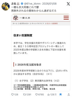 一橋大学さん、女子学生限定住まい支援制度を導入wwwwwww