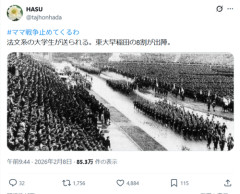 1: 2026/02/08(日) 20:14:31.91 #ママ戦争止めてくるわ法文系の大学生が送られる。東大早稲田の8割が出陣。 pic.twitter.com/VaYoRNEDzt— HASU (@tajhonhada) February 8, 2026 ※関連記事 高市「中国に宣戦布告します!徴兵開始よ!」←ガチでこうなりそうで怖いんやが…