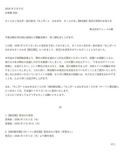 引用元: 217: Vtuberまとめ (ワッチョイW d4e5-pEym) 2026/02/09(月) 10:55:57.31 ID:oG6hjJr1 フレーベル館 出版 @froebelkanbooks (2026/02/09 10:48:34) 【発売日変更のお知らせ】 3月5日(木)に発売を予定しておりました、『みこぴーと おおきな さくらのき』【限定版】につきまして、発売日を3月30日(月)に変更させていただくこととなりました。 楽しみにお待ちいただいている皆様には、多大なるご迷惑をおかけすることを、心より深くお詫び申し上げます。 なお、初回限定版、ローソン限定版につきましては予定通り3月5日(木)に発売いたします。 こちらにつきましてもどうぞよろしくお願いいたします。 【発売日変更のお知らせ】 3月5日(木)に発売を予定しておりました、『みこぴーと おおきな さくらのき』【限定版】につきまして、発売日を3月30日(月)に変更させていただくこととなりました。… pic.twitter.com/VxDfVMtWn6 — フレーベル館 出版 (@froebelkanbooks) February 9, 2026 218: Vtuberまとめ (ワッチョイ 15e5-XcmX) 2026/02/09(月) 10:56:24.33 ID:wHAHic5m >>217 さくらみこ先生に笑うわ 219: Vtuberまとめ (ワッチョイ ac1e-tclB) 2026/02/09(月) 10:56:35.69 ID:O24I3SzE >>217 売れすぎたんだなしょうがないね 220: Vtuberまとめ (ワッチョイW 8722-2orr) 2026/02/09(月) 10:57:24.86 ID:A1cFegfH >>217 そんなに売れたんか 224: Vtuberまとめ (ワッチョイW 88f9-0QZu) 2026/02/09(月) 10:57:52.48 ID:2ItQIv1b >>217 ローソンとAmazon なら発売日に買えるんかこれ? 225: Vtuberまとめ (ワッチョイW c012-eNQa) 2026/02/09(月) 10:57:58.32 ID:bL1lSOAE >>217 みこアンがあんなに売れないんだあああああああって騒いでたのに… あまりにも恥ずかしい 230: Vtuberまとめ (ワッチョイ ac1e-tclB) 2026/02/09(月) 10:58:48.84 ID:O24I3SzE >>224 だから特典が違う奴は予定通り発売して 特別版は付録の資材調達が間に合わないって言ってるんだよね 231: Vtuberまとめ (ワッチョイW 1465-nFKl) 2026/02/09(月) 10:59:01.80 ID:zCG4J9FC >>217 みこアン婆さん共大敗北で草 232: Vtuberまとめ (ワッチョイW 1586-xF3P) 2026/02/09(月) 10:59:14.28 ID:6PZyXIgl >>217 売れすぎて生産ライン再編とかすごいな 242: Vtuberまとめ (ワッチョイW 88f9-0QZu) 2026/02/09(月) 11:02:06.62 ID:2ItQIv1b >>230 ローソンの初回限定版はいけるけど他は遅れるって理解で良いんかな? 246: Vtuberまとめ (ワッチョイ ac1e-tclB) 2026/02/09(月) 11:03:10.25 ID:O24I3SzE >>242 絵馬付きだけ遅れるわって事だろ ローソンの塗り絵付きとかは予定通り発売って事なんだろうね 254: Vtuberまとめ (ワッチョイ 15eb-CE7O) 2026/02/09(月) 11:04:57.36 ID:B8vYQbzb >>246 限定版だけ遅れるから遅れるのはレターセットじゃね 256: Vtuberまとめ (ワッチョイ ac1e-tclB) 2026/02/09(月) 11:05:25.47 ID:O24I3SzE >>254 そうなのか3冊買ったから何でもええわ…