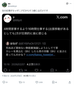 【悲報】女さん「4時間家事するより16時間仕事する方が圧倒的に楽に感じる」→炎上wwww