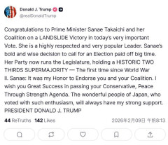 転載元: それでも動く名無し 2026/02/09(月) 14:50:52.11 ID:Z+anRp0w0 アメリカのトランプ大統領はSNSで高市総理大臣が率いる自民党が衆議院選挙で圧勝したことについて祝意を示しました。 「サナエ氏が大胆かつ賢明に選挙を決断したことが大きな成果をもたらした」と評価した上で、「サナエ、あなたの連立政権を支持できたことは私の名誉だ。 あなたの保守的な「力による平和」政策が成功することを心から願っている」などと投稿しました。 2: それでも動く名無し 2026/02/09(月) 14:51:26.38 ID:1ShGBPcU0 もう連立も要らない模様…