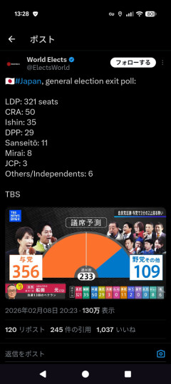 1: 2026/02/09(月) 13:32:20.28 🇯🇵#Japan, general election exit poll:LDP: 321 seatsCRA: 50Ishin: 35DPP: 29Sanseitō: 11Mirai: 8JCP: 3Others/Independents: 6TBS pic.twitter.com/TR34ciPDYV— World Elects (@ElectsWorld) February 8, 2026 ※関連記事 【五輪】驚くほど盛り上がらない 「世間が選挙一色であんまオリンピック盛り上がってない」の声も…