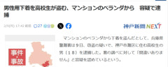 1: 2026/02/09(月) 18:18:08.84 マンションのベランダから下着を盗んだとして、兵庫県警灘署は9日、窃盗の疑いで、神戸市灘区に住む高校生の男(18)を逮捕した。署の調べに対して「間違いありません」と容疑を認めているという。 逮捕容疑は1月20日午後7時15分ごろ、神戸市灘区のマンションで、1階にある一室のベランダから男性用の下着2点を盗んだ疑い。 署によると、住人の男性(28)が「下着がなくなることが何度かあった」と署に相談。男性がベランダに設置した防犯カメラの映像を解析するなどして男が関与した疑いが強まったと判断したという。 男性用下着を高校生が盗む、マンションのベランダから 容疑で逮捕 ※関連記事 フォロワー13万人の人気美女インフルエンサー(26)さん、最悪の秘密がバレて人生終了する・・・…