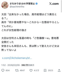 1: 2026/02/09(月) 15:36:06.52 太田「出来なかった場合、高市総理はどう責任とる?」高市「何か意地悪やな〜これから一生懸命やろとしてんのに」これが女性総理の強さ太田は甘利さん落選の時も「ご愁傷様〜w」意地悪全開だった安倍さんも岸田さんも、男は黙って耐えたけど女は黙ってないよ — さちみりほ@AI学習禁止 (@sachimiriho) February 8, 2026 ※関連記事 爆笑問題・太田光さん「飲食料品消費税0%、できなかった場合どうやって責任を取るの?」→高市首相の回答がこちら…