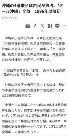 1: 名無しのスコールさん 2026/02/09(月) 12:28:05.08 ID:ceNOvOn/0 沖縄全選挙区で自民が勝ったし😅 引用元: ・…
