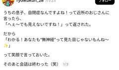 1: 2026/02/10(火) 01:22:36.95 え??????この返しが一番無難では…?? なんでこの人怒ってるの??「そう見えますね!」ならもっと怒るでしょ??怖すぎなんだけど pic.twitter.com/0UK9IkBX9E— めぐチャン😃season2‼️‼️ (@omegudayon) February 9, 2026 ※関連記事 【画像】自閉症のバービー人形、特徴が”ガチ”だと話題に…