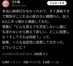 1: 2026/02/10(火) 02:03:56.09 本当に納得行かなかったので、すぐ連絡できて関係がこじれる心配のない親類11人、友人6人に片っ端から連絡してみた。慎重に「どんな答えでも否定しないし誰にも言わないから教えて欲しい、どこに投票した?そしてそれは何故?」って。結果、一人も自民党に投票してなかった。どういうこと?— ゴミ箱 (@trush_sns) February 9, 2026 ※関連記事 自民党圧勝の選挙結果、外国人に馬鹿にされまくってしまう・・・「日本人は民主主義を理解してない」「日本人はマジで知的障害者」…