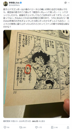 1: 2026/02/10(火) 06:54:09.84 息子とドラゴンボール21巻のベジータとの戦いが終わる辺りを読んでたら、悟空役の息子がここ読んで「悟空が<オレ>って言ったー!」ってびっくりしたから、前後をチェックしてもここ以外はやっぱ「オラ」としか言ってない…ちなみにこれは1990年発行の単行本で、うちにあるもう一冊の2024年発行の方もチ… pic.twitter.com/beed8N8qyV— 宇多田ヒカル (@utadahikaru) February 9, 2026 ※関連記事 スクエニ「キングダムハーツのテーマ曲作ってくれんか?」宇多田ヒカル「おかのした」…
