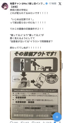 1: 2026/02/10(火) 16:59:52.38 【速報】神奈川県の学校にこれが配られてるみたいです!!!!「いじめは犯罪です!」って紙は配らないのにね!!!!!てかこの画像の印象操作すご!!"蹴ってる人"より"撮ってる人"が悪く見えるようにしてて"加害者が泣いてる"イラストで同情稼ぎ?終わっててしぬが!!!!!! pic.twitter.com/e6y1FalGRb— 地雷チャン@No.1推し活インフルエンサー/歌い手 (@amatsuuni) February 9, 2026 2月4日に投稿した暴力の様子を映したSNSへの投稿・拡散などに対する注意喚起の内容について、配慮に欠ける表現がありましたので、投稿内容を削除いたします。— 神奈川県警察少年育成課 (@KPP_ikusei) February 10, 2026 【朗報】神奈川県警、自分たちの間違いに気づく。《神奈川県警の担当者の方へ》もうプリントは色んな学校にに配ってしまったと思うのでどうか"いじめ自体を罰し、抑止出来るような方針"で作り変え再度学校に配布して頂けないでしょうか。そもそも暴力行為がなければ… — 地雷チャン@No.1推し活インフルエンサー/歌い手 (@amatsuuni) February 10, 2026 ※関連記事 【画像】この漫画の「ダメ人間」と付き合っている彼女の話、少し怖くて草wwwww…