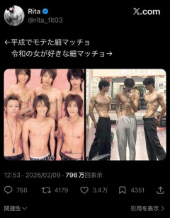 1: 2026/02/10(火) 17:55:58.39 ←平成でモテた細マッチョ 令和の女が好きな細マッチョ→ pic.twitter.com/IbhFoAuzAl— Rita (@rita_fit03) February 9, 2026 ※関連記事 【動画】マッチョ(122kg)と格闘家(56kg)の喧嘩がとんでもないwww…