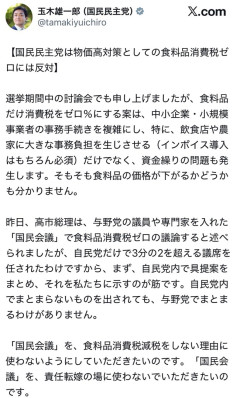 国民民主・玉木「高市は2/3持ってるんだから消費税減税できないの野党のせいにするなよ」