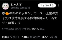 1: 2026/02/10(火) 20:23:42.082 草参🍊のあのオッサン、カースト上位の女子だけ依怙贔屓する体育教師みたいなビジュ無理すぎ— にゃんぽ (@oimo_tempura) February 8, 2026 ※関連記事 参政党のヤバいエピソードで打線組んだwwwww…