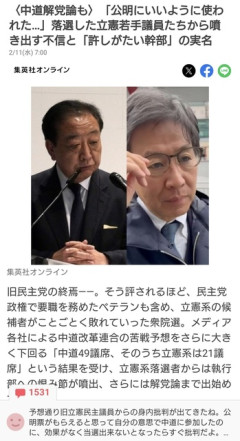 1: ミルーノ(東京都) [DE] 2026/02/11(水) 09:30:26.43 ID:9h/b9Kjn0● BE:662593167-2BP(2000) sssp://img.5ch.net/ico/taxi.gif 引用元: ・ スポンサーリンク スポンサーリンク 2: ベスティーちゃん(庭) [US] 2026/02/11(水) 09:30:47.45 ID:s1Uff9ek0 内ゲバで2度楽しめる 3: ヨドちゃん(茸) [GB] 2026/02/11(水) 09:30:54.59 ID:cish5rqW0 公明の罠 4: しんた(ジパング) [PL] 2026/02/11(水) 09:32:43.45 ID:LxT0kXFp0 左派特有の総括リンチが始まる 6: ピンキーモンキー(ジパング) [CN] 2026/02/11(水) 09:32:54.10 ID:2nlMtTlv0 こうなるとわからなかった時点で議員やる資格ねえだろ。 甘えるな。 7: ワラビー(ジパング) [EU] 2026/02/11(水) 09:33:43.83 ID:uOyQbskQ0 原口「でも、俺があれほど警告したのにそっちへ行ったのはお前らの自己責任だよw」 8: フクタン(大阪府) [ニダ] 2026/02/11(水) 09:34:28.39 ID:Rd2JVGcW0 入信してから文句言うなよ 10: ラビディー(ジパング) [CN] 2026/02/11(水) 09:36:08.99 ID:v5I4MuX+0 合流する前に言えよw 37: 名無しさん@涙目です。(長野県) [GB] 2026/02/11(水) 09:54:13.30 ID:PnoIscTs0 >>10 公示3日前に言われてもなあ 42: たまごっち(みょ) [CN] 2026/02/11(水) 09:55:33.06 ID:hnoZ3poF0 >>37 その段階で野田なり安住を殴りつけるべきだったな 11: ごーまる(庭) [ニダ] 2026/02/11(水) 09:36:49.38 ID:1QcztJGP0 これはまあ気持ちはわかるw 12: ドナルド・マクドナルド(やわらか銀行) [ニダ] 2026/02/11(水) 09:37:14.53 ID:+tgnquuJ0 そうだそうだ入信した(ような発言だった)野田は犬勝利だったじゃないか!!!!! 旧公明党幹部は100%勝って議席迄増えたけど 14: らぴっどくん(福岡県) [GB] 2026/02/11(水) 09:38:36.29 ID:JR0uvctH0 だから離党、合流前に言えって 不満があったグチェや青山大人は新党結成するなり無所属で出馬なりして、結局は落選したけど選挙戦ってたぞ 寄らば大樹の陰でいい気になってたくせに落選したら不満って、あまりにムシが良すぎると思わんか 53: 買いトリーマン(大阪府) [SG] 2026/02/11(水) 10:02:14.05 ID:WFztTWbO0 >>14 それが全てやな 15: ビタワンくん(やわらか銀行) [ヌコ] 2026/02/11(水) 09:38:48.34 ID:9nJv15W80 野田のファンも斉藤のファンも居るのに頭沸いてんのか? 居ないと思っての発言ならいいんだけど 16: ドンペンくん(庭) [GB] 2026/02/11(水) 09:40:01.09 ID:Yq2Igvog0 旧社会党の隠れ蓑が潰れた意義は大きい。 野田は国士である。みな讃えよ。 18: エンゼル(茸) [ES] 2026/02/11(水) 09:40:56.01 ID:+p/zhQLx0 分離すると野党第一党の肩書を失うんだよな 23: ワラビー(ジパング) [EU] 2026/02/11(水) 09:44:32.76 ID:uOyQbskQ0 >>18 これは公明の罠w プライドだけは一人前の立憲議員が国民民主を野党第一党にするくらいなら!と立憲に戻らせない策略 40: たまごっち(みょ) [CN] 2026/02/11(水) 09:54:30.16 ID:hnoZ3poF0 >>23 戻ると議長委員長は一人も出せないからな 48: ↓この人痴漢で(埼玉県) [HU] 2026/02/11(水) 09:59:07.39 ID:EGKsWKTb0 >>18 自民は嫌だけど泡沫にはなりたくない、野党の中では第一党というのがアイデンティティだったと思うんだけど、その肩書失ったら立憲議員が立憲に留まる理由がなくなるのよね どうせ政策なんてどうでもいい人達なんだろうし 19: ドナルド・マクドナルド(やわらか銀行) [ニダ] 2026/02/11(水) 09:41:30.98 ID:+tgnquuJ0 立憲が何か日本の為になる事をしててくれてたら 少しは同情してやるのに 辻元なんかあの仕事で月500万 20: 緑山タイガ(庭) [DE] 2026/02/11(水) 09:42:11.26 ID:RunvOvym0 これ最初の段階で予想されてたよな。選挙区強かった岡田安住はともかく若手や新人には比例復活実質なしとか厳しすぎたろ 22: ココロンちゃん(ジパング) [ニダ] 2026/02/11(水) 09:43:15.83 ID:3Fi6Mzsn0 枝野を見習えカスども 34: マコちゃん(茸) [ニダ] 2026/02/11(水) 09:52:22.90 ID:esLyvlie0 >>22 枝野だけだよね、自分の力不足と言ってのは 24: お父さん(岡山県) [CN] 2026/02/11(水) 09:45:35.74 ID:D72BD+200 離れたら国民民主や公明の下の野党第3党に落ちぶれる つべこべ言ってねーで2年後の参院選までに参院も中革連にまとめとけ もしかしたら次は勝てるかもしれないだろ 51: トウシバ犬(ジパング) [CN] 2026/02/11(水) 10:00:16.06 ID:tQyMZ7vS0 >>24 参院の名簿は候補者名を書くから学会員は公明議員の名前しか書かないな 立民議員で名前で当選出来るの何人居るやら 26: モバにゃぁ?(茸) [ニダ] 2026/02/11(水) 09:46:25.73 ID:Cb/g7hsJ0 常に誰かを批判してないと 気が済まない奴ているよな 立憲はそれの集まり 28: エンゼル(ジパング) [KR] 2026/02/11(水) 09:48:49.90 ID:TNeRLaNM0 耐え難きを耐え 忍び難きを忍び 30: ニッパー(庭) [US] 2026/02/11(水) 09:51:10.31 ID:SOaVAWf80 別に強制はしてない 独立して無所属で選挙する自由はいくらでもあった 他人のせいにしないように 31: KEN(やわらか銀行) [US] 2026/02/11(水) 09:51:11.77 ID:Vnhy1koM0 自分たちも政策曲げてまで利用しようとしてるように見えたが 見間違いか? 35: たぬぷ?店長(茸) [JP] 2026/02/11(水) 09:53:06.05 ID:igeqTou60 自民もそうだったからぬけるように仕向けたのに 36: たまごっち(みょ) [CN] 2026/02/11(水) 09:53:10.56 ID:hnoZ3poF0 合流前に出された条件通りだろ? 挙げ句に比例の公明はちゃんと当選したんだから新党の名前は浸透してた 39: ↓この人痴漢で(埼玉県) [HU] 2026/02/11(水) 09:54:26.62 ID: