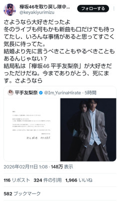 【画像】平手友梨奈が結婚するから自◯しそうなオタクが見つかるwwwwwwwwwwww
