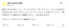 1: 2026/02/12(木) 11:51:31.48 時計じかけのオレンジ、ファイトクラブ、ダークナイト、チェコら辺のわけわかんないストップモーションアニメ、トレインスポッティング、「男が好きだった場合キモい映画リスト」、まだありますか— おさしみのたんぽぽ (@_O_ST) February 10, 2026 ※関連記事 【画像】どんなホラー映画より『秋田県のハローワーク』が怖いと話題に……