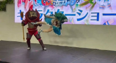 【動画】『プリオケ』キャラクターショーのドロップキックがエグすぎるwww「仮面ライダーでもこんなに高く飛べない」
